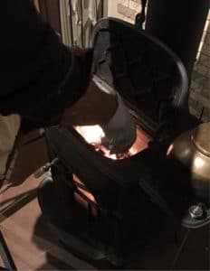 更に太めの小枝( 5センチ位) を薪ストーブの上から入れていきます。